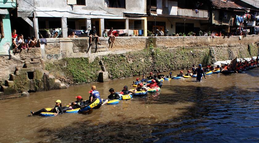 Beberapa puluh pengarung sungai ‘mengular’ menggunakan ban dalam mobil (kukuyaan) sedang melintasi bantaran sungai cikapundung di kawasan braga disaksikan penduduk setempat. perhelatan ini digelar oleh komunitas sungai cikapundung sebagai upaya membangkitakan kesadaran akan pentingnya menjaga kualitas air sungai cikapundung yang membelah kota bandung. Semoga kelak tanpa ragu kita bisa bermain di sungai cikapundung tanpa khawatir gatal-gatal.